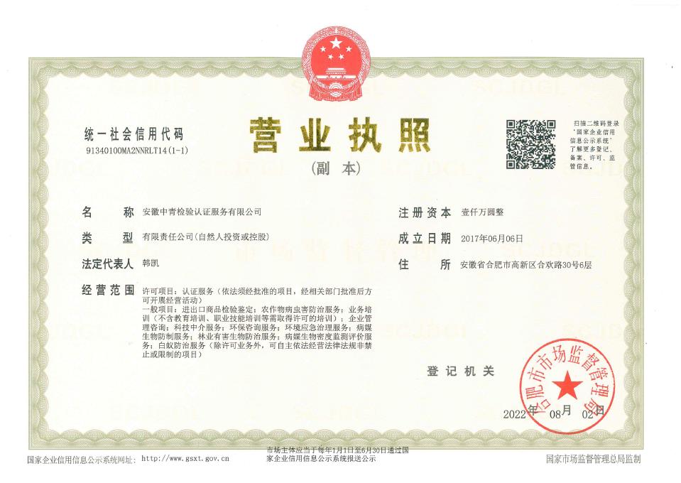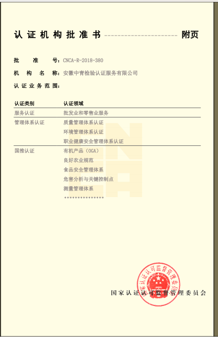 安徽中青檢驗(yàn)認(rèn)證服務(wù)有限公司成立于2017年6月6日,2018年1月3日通過(guò)國(guó)家認(rèn)證認(rèn)可監(jiān)督管理委員會(huì)批準(zhǔn),現(xiàn)認(rèn)證領(lǐng)域:質(zhì)量管理體系、環(huán)境管理體系、職業(yè)健康安全管理體系、食品安全管理體系、HACCP管理體系、有機(jī)產(chǎn)品認(rèn)證、良好農(nóng)業(yè)規(guī)范、服務(wù)體系、醫(yī)療器械質(zhì)量管理體系、企業(yè)誠(chéng)信管理體系、食品工業(yè)企業(yè)誠(chéng)信管理體系、食安安徽品牌等類別認(rèn)證。